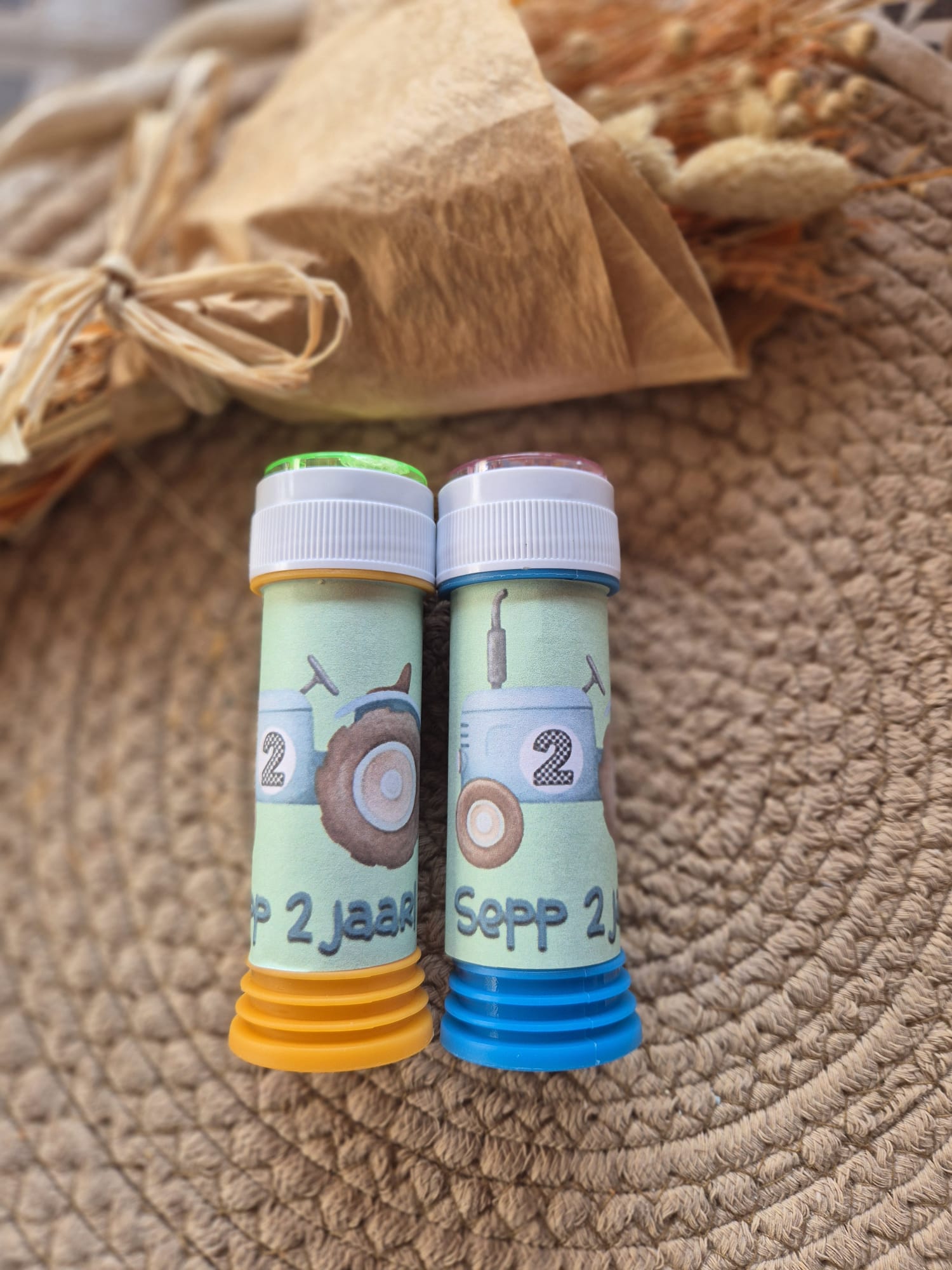 Het bellenblaasje wordt voorzien van een wikkel in trekker-thema, gepersonaliseerd met de naam en leeftijd van de jarige. Een vrolijke traktatie die niet alleen leuk is om te geven, maar ook om mee te spelen op school of tijdens een feestje.