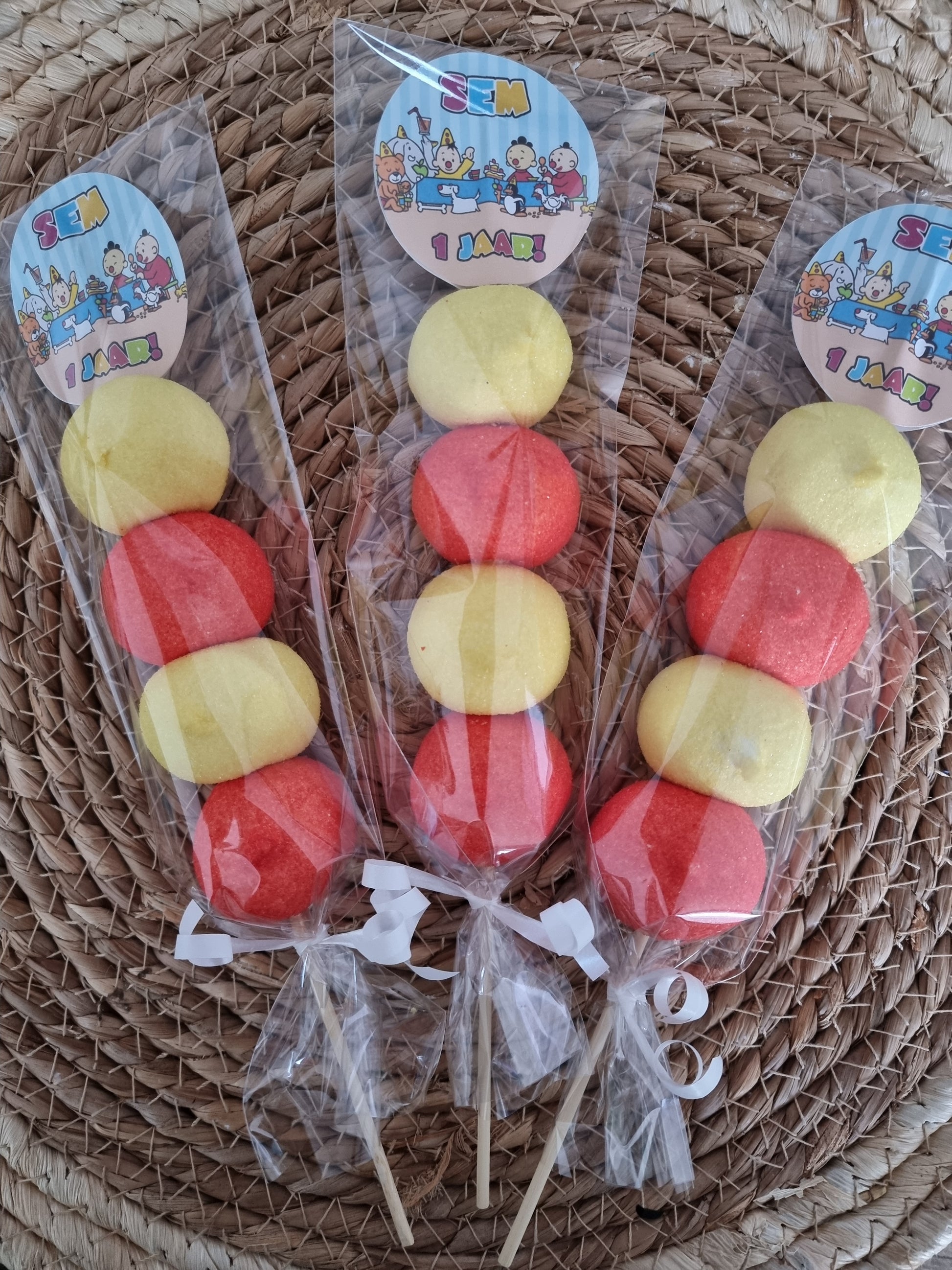 Mag jij trakteren en ben je ook zo gek op Bumba? Kijk deze coole traktatie met spekbollen met Bumba. Op een saté prikker zitten 4 gekleurde spekbollen in 3 typische Bumba kleuren. Ze zitten verpakt in een cellofaan en zijn afgewerkt met een strikje. Helemaal coronaproof dus. Bovenaan een stokje zit ter versiering nog een mooi rond labeltje met daarop de naam en leeftijd van de jarig Job of Jet. Vertel ons gauw hoe je heet en hou oud je bent geworden!