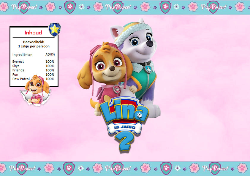 Vier jouw feestje met onze gepersonaliseerde chipswikkels in roze Paw Patrol thema met in de hoofdrol Skye en Everest! In de wikkel zit een lekker zakje chips of popcorn verstopt en je kunt kiezen uit Lays Partymix of uit een mix van zoute en zoete popcorn. Een super leuke traktatie om uit te delen! Laat ons gauw weten hoe je heet en hoe oud je bent geworden!