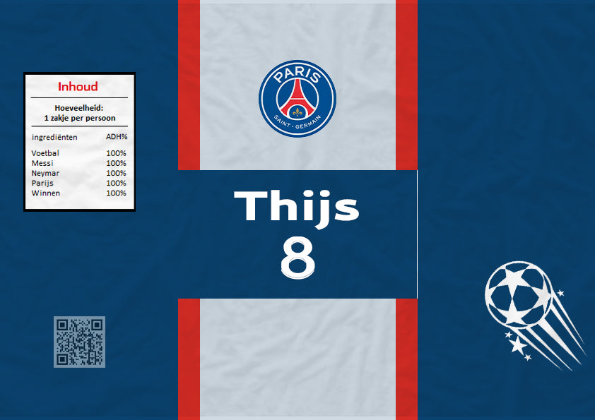 Laat je vriendjes en vriendinnetjes weten dat jij de trouwste PSG fan bent! Onze chipswikkels in thema van Paris-Saint-Germain maken jouw feestje compleet. Ze zijn gepersonaliseerd met de naam en leeftijd van de jarige Job of Jet. In de wikkel zit een lekker zakje chips of popcorn en je kunt kiezen uit Lays partymix of een mix van zoete/zoute popcorn. Laat ons gauw weten hoe je heet en hoe oud je wordt!