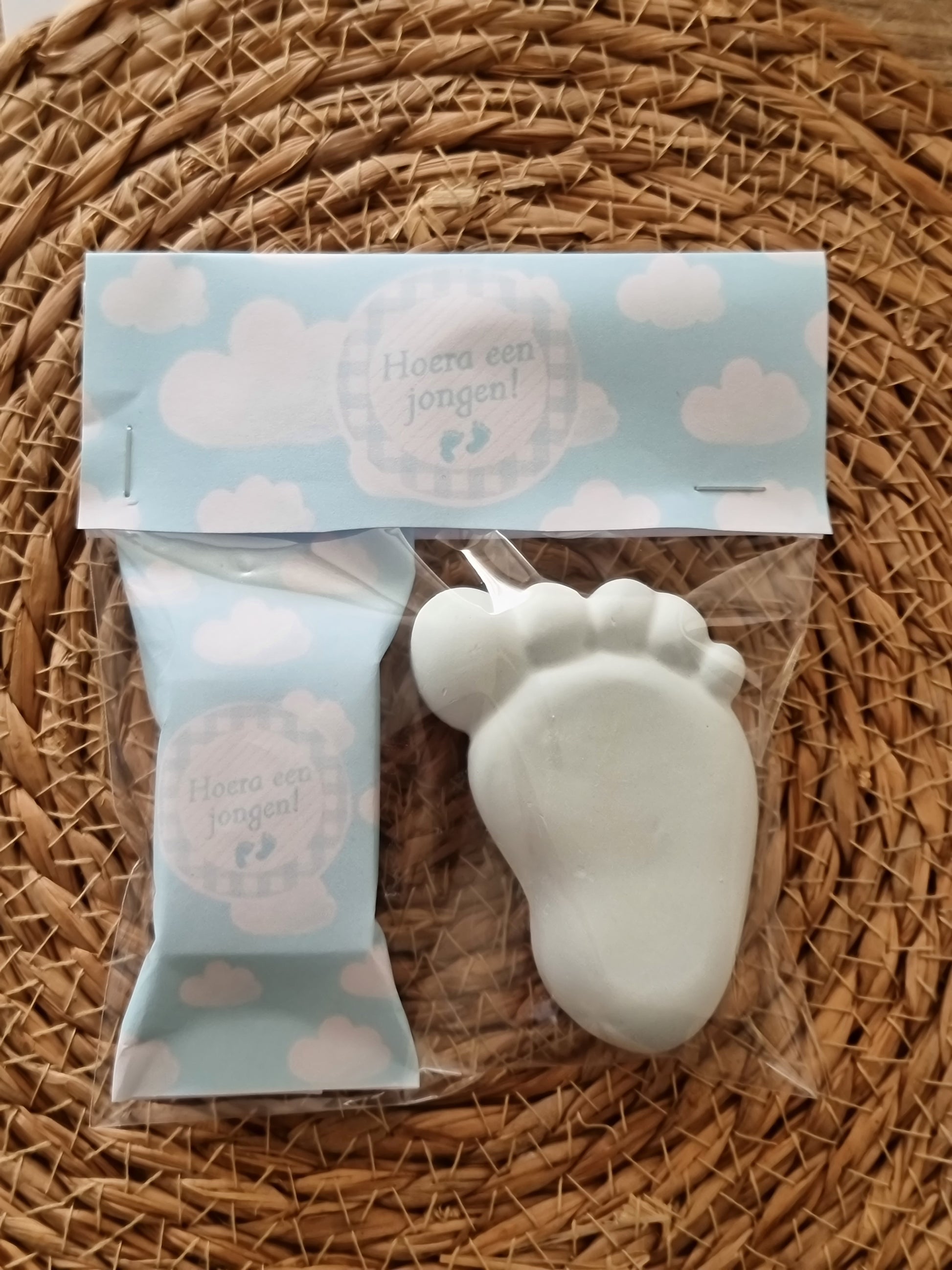 Een leuk traktatiezakje voor de geboorte van een zoon of broertje. In het zakje zit een doosje rozijntjes en een handgemaakt stoepkrijtje in de kleur blauw. Het zakje is afgewerkt met een mooi labeltje. Leuk om uit te delen! De stoepkrijtjes zijn ook los verkrijgbaar. Om die te bekijken, klik HIER