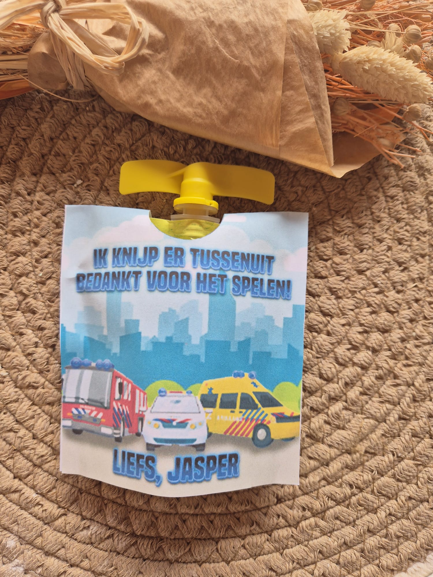Is jouw jarige een echte fan van politie, brandweer of ambulance? Dan is onze knijpfruit traktatie in Hulpdiensten-thema precies wat je zoekt! Met deze stoere knijpfruitjes maak je van elk feestje een spektakel. Een gezonde én originele traktatie, perfect voor school of het kinderfeestje.