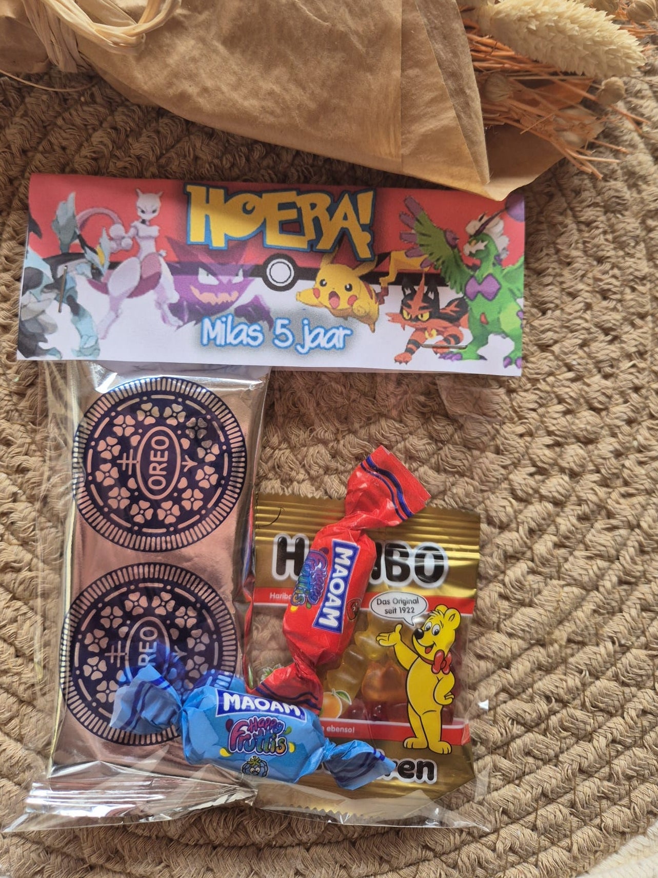 Elk zakje wordt feestelijk gevuld met een mix van lekkere snoepjes van Maoam en Haribo. Ook doen we er een lekker Oreo koekje bij en alles wordt mooi afgewerkt met een label waarop wij de naam en leeftijd van de jarige zetten. Zo maak je een traktatie die niet alleen leuk én lekker is, maar ook echt persoonlijk.